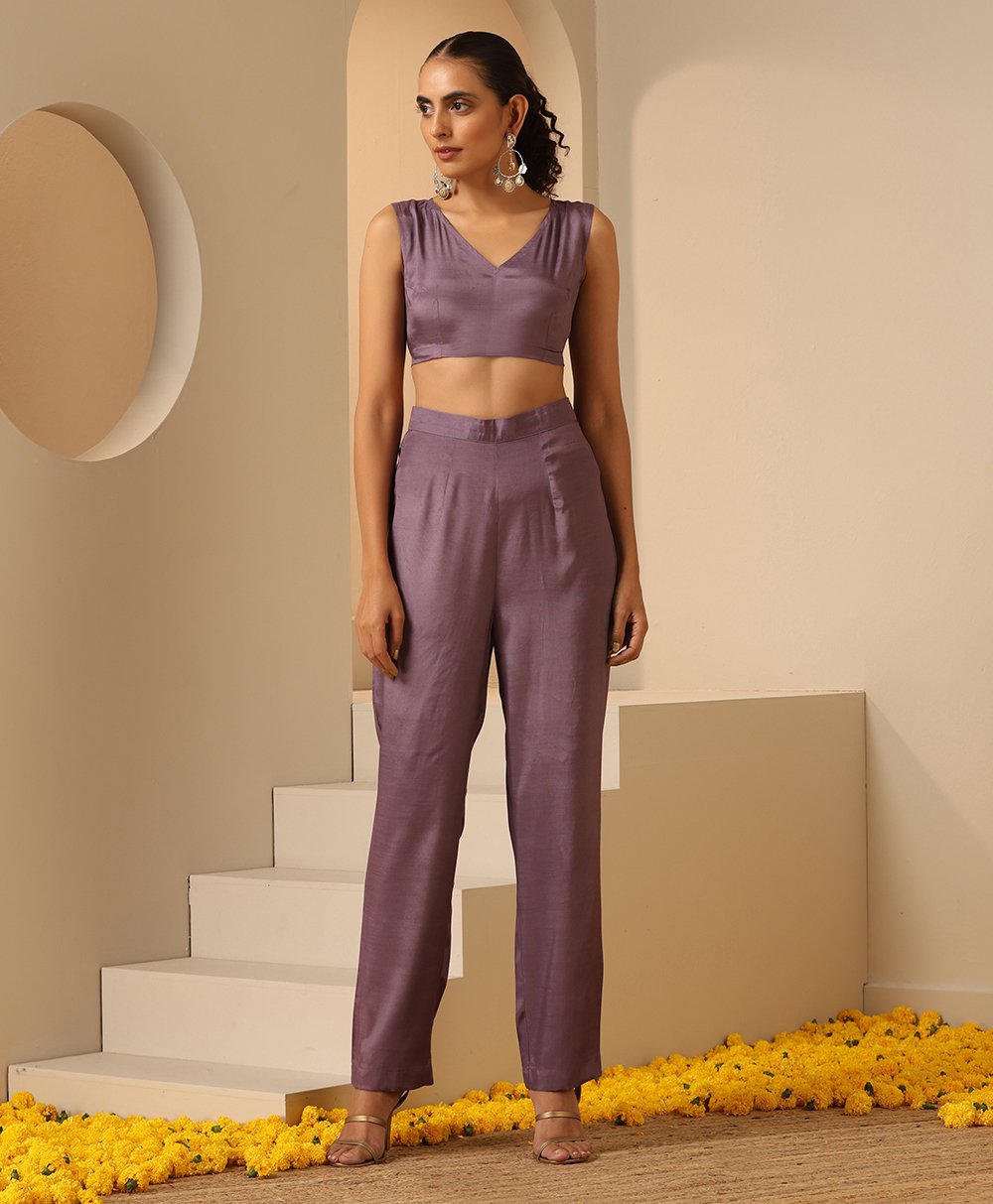 Sleeveless inner blouse paired with elasticated pants, Wrapped with an overlap angrakha giving it a perfect evening wear look.