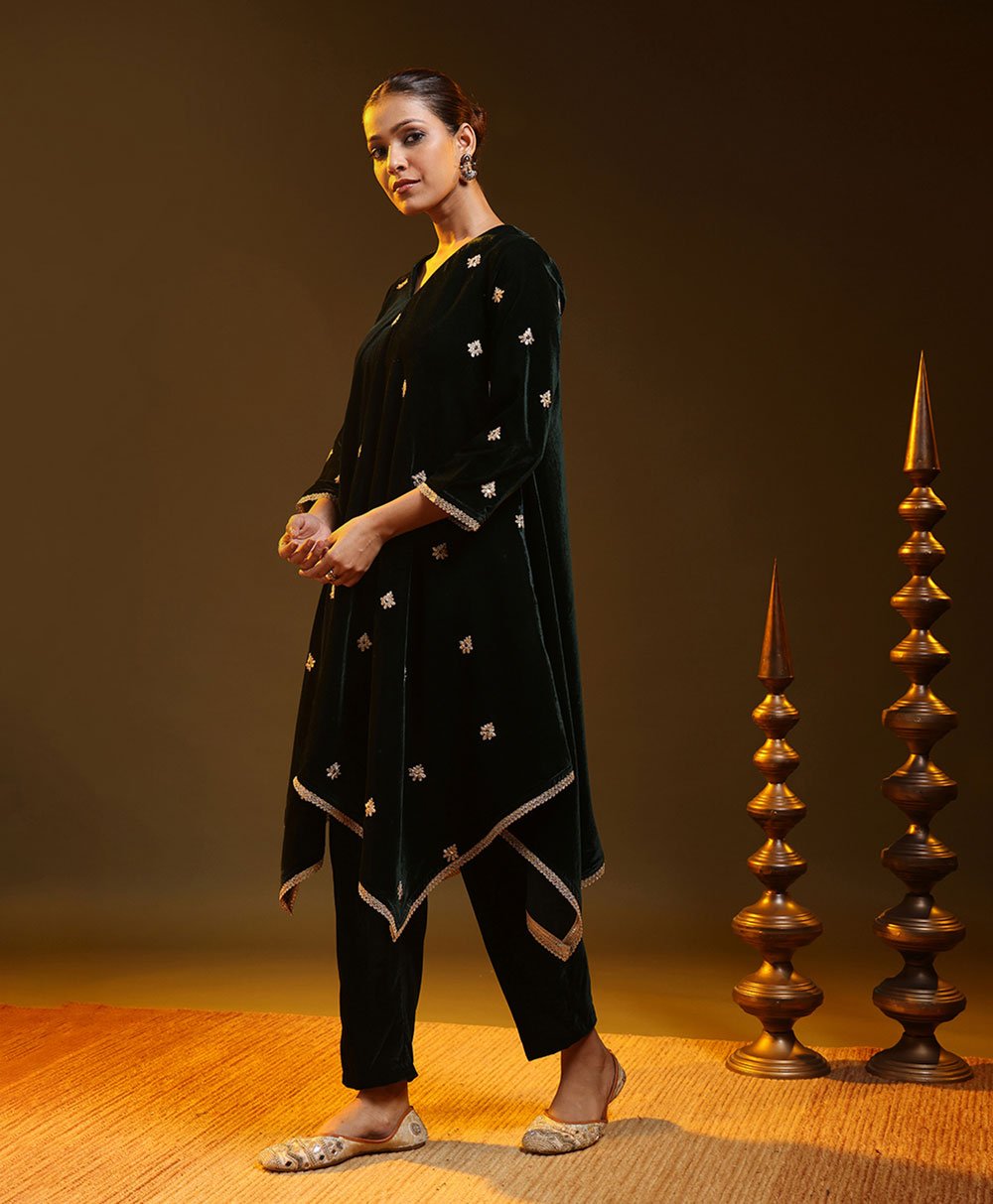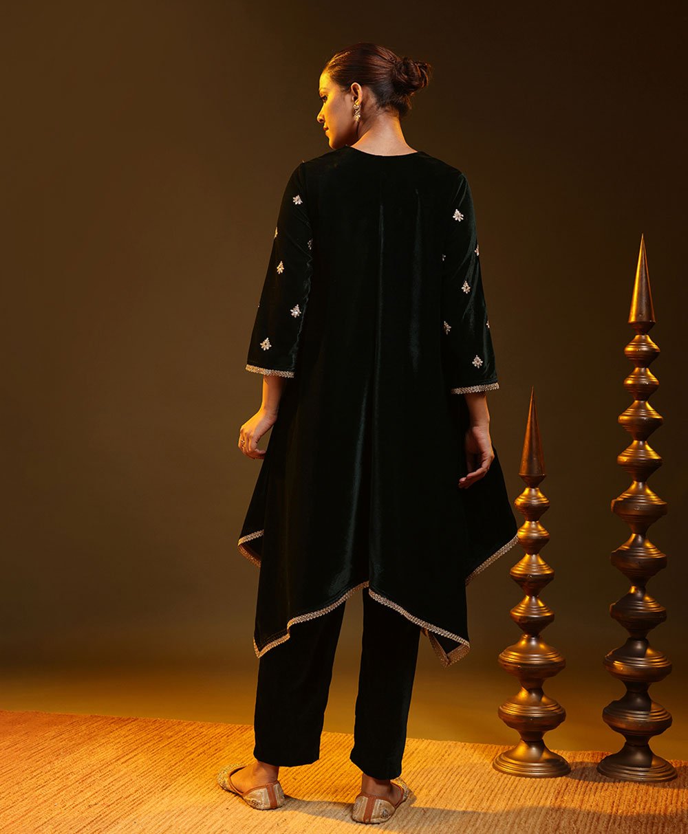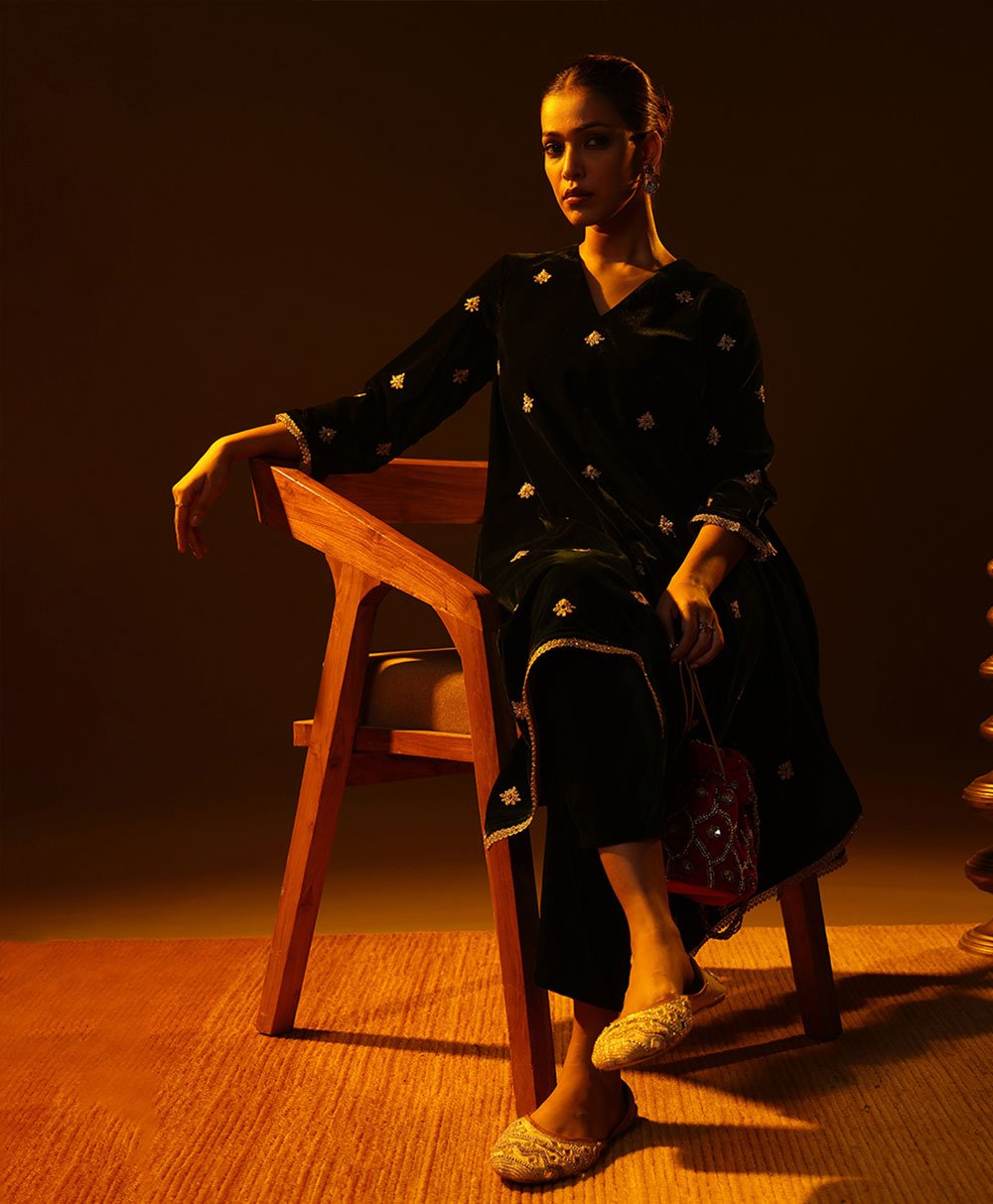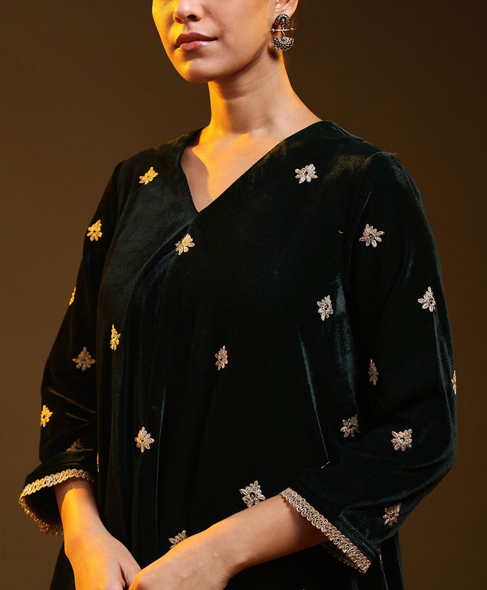 This Bottle Green kurta set showcases a relaxed silhouette accented with subtle metallic trim on the sleeves and shoulders. Paired with straight pants, it delivers understated sophistication and comfort. Perfect for evening events or festive gatherings, this timeless ensemble blends minimal design with refined traditional elegance.