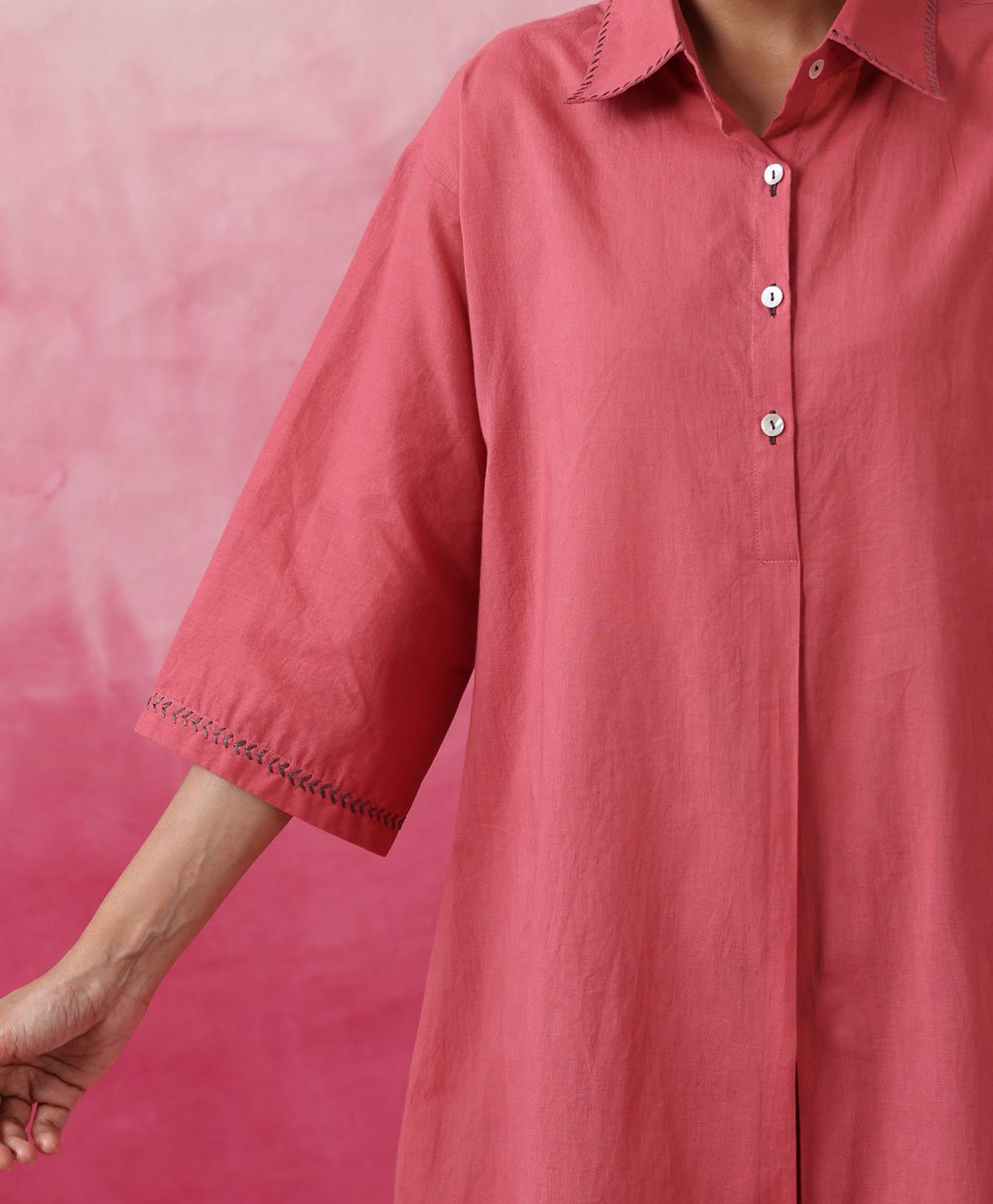Front open rose pink shirt with pleat in front, ¾ loose fir sleeve shirt with contrast stitch detail , paired with elasticated Straight pants.