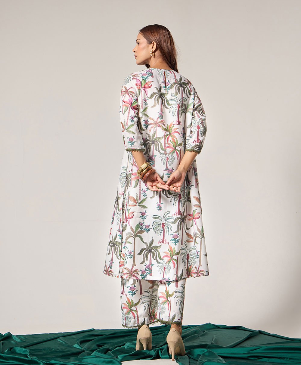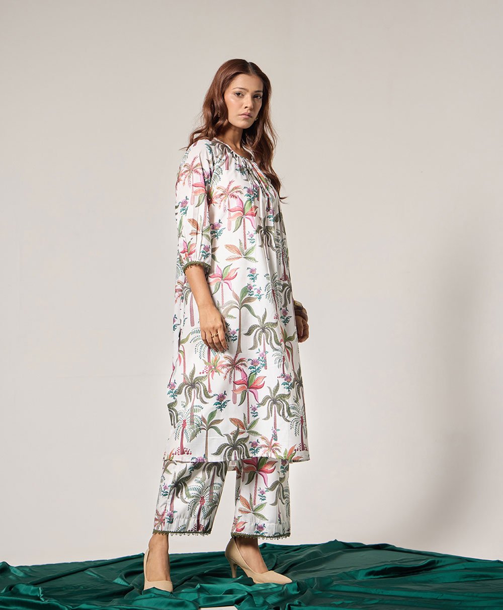Ecru Printed Cotton Kurta with Pants- Set of 2 – Mist Flora