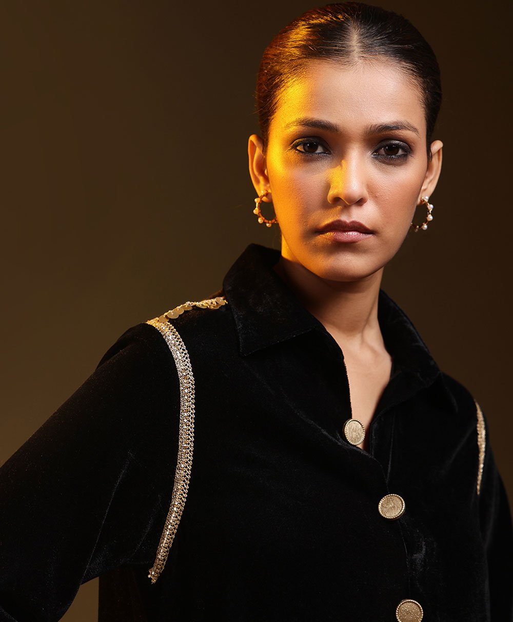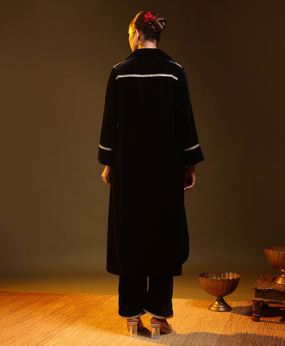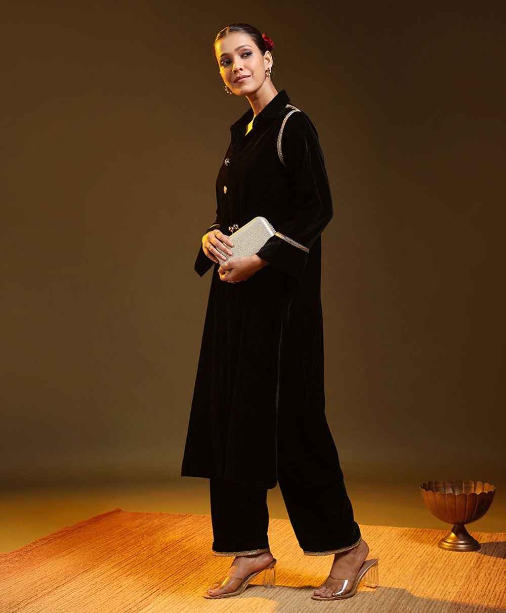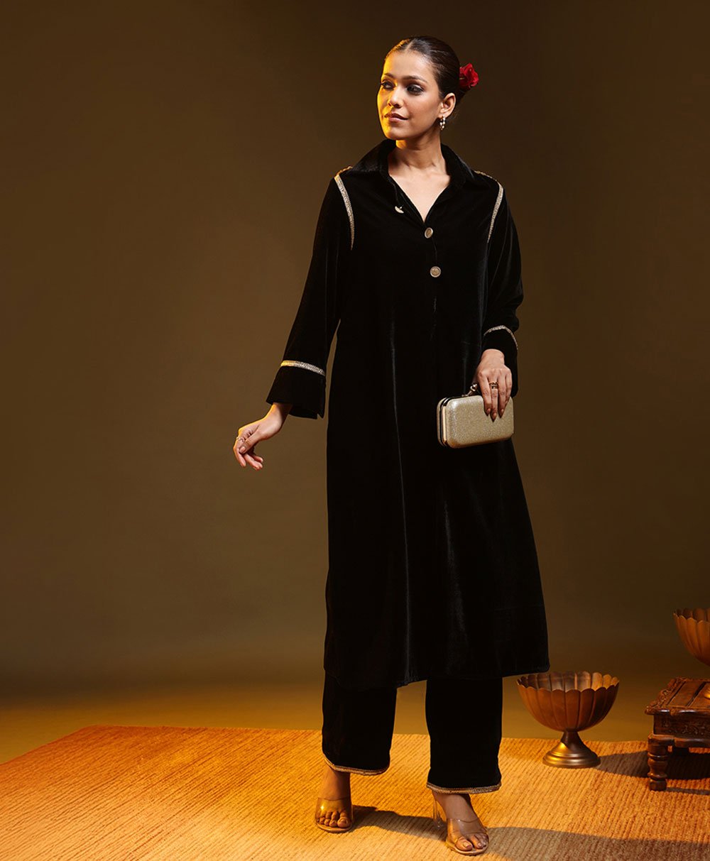 Minimal black kurta set with a relaxed silhouette and subtle metallic detailing. Crafted in soft fluid fabric for effortless movement and comfort. Paired with straight pants for a clean modern look. Perfect for evening gatherings festive occasions and understated celebrations where quiet elegance speaks louder than excess.
