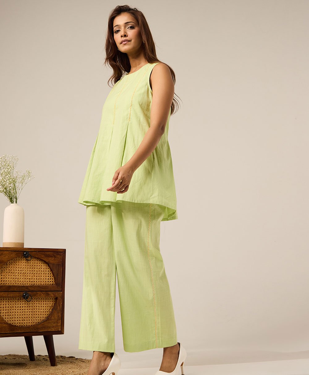 Graceful, breezy, and effortlessly stylish, the Mint Green Embroidered Cotton Co-ord Set is your go-to outfit for effortless sophistication. The Mint Green cotton top boasts intricate embroidery that adds texture and depth, while its round neckline and sleeveless cut allow for breathable elegance. Complementing the top, the Mint Green cotton pants feature a fully elastic waist, promising a seamless blend of comfort and style. Whether worn for a laid-back brunch or a relaxed evening gathering, this two-piece co-ord set is a refreshing addition to your wardrobe, radiating a blend of simplicity and refined grace.