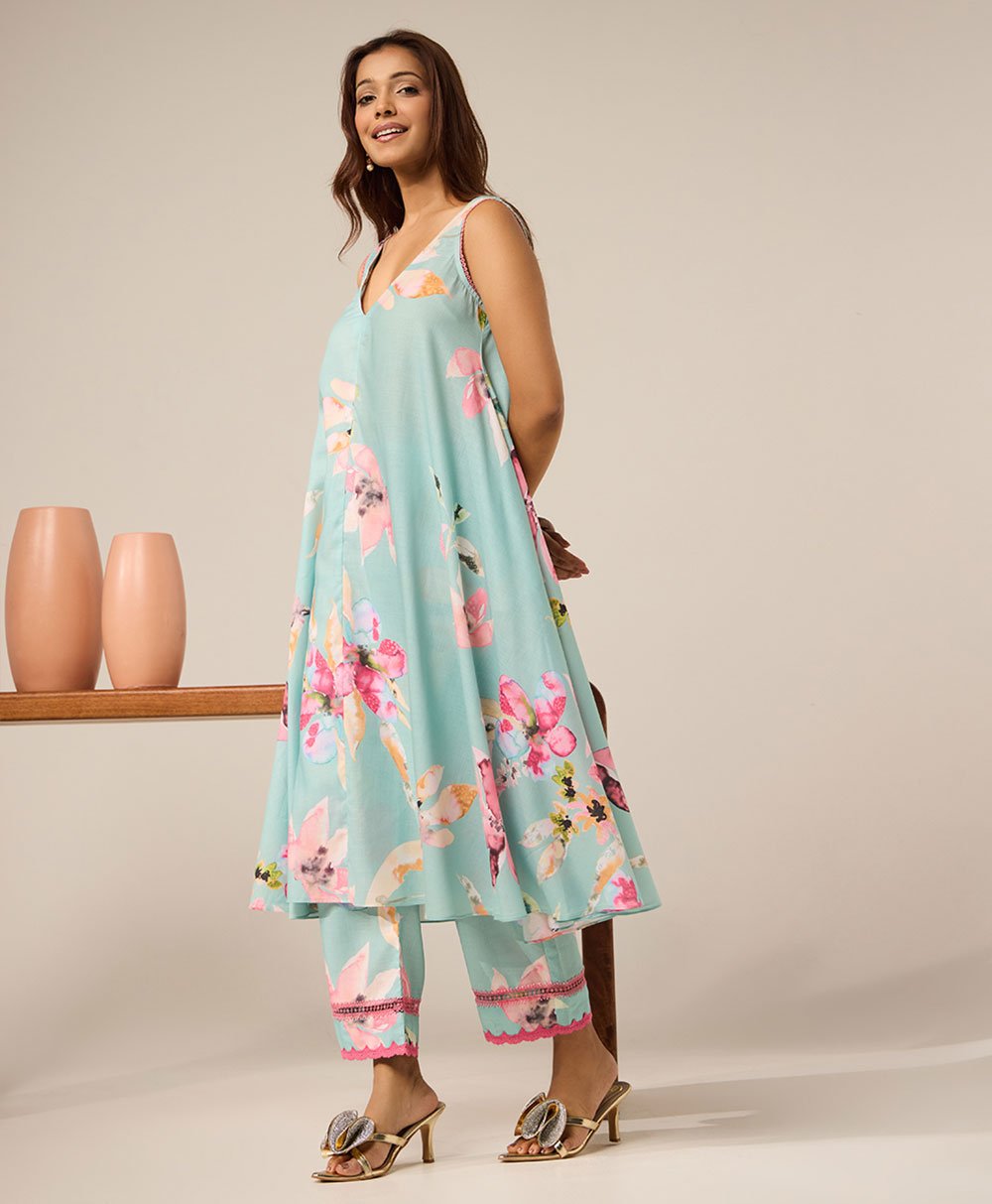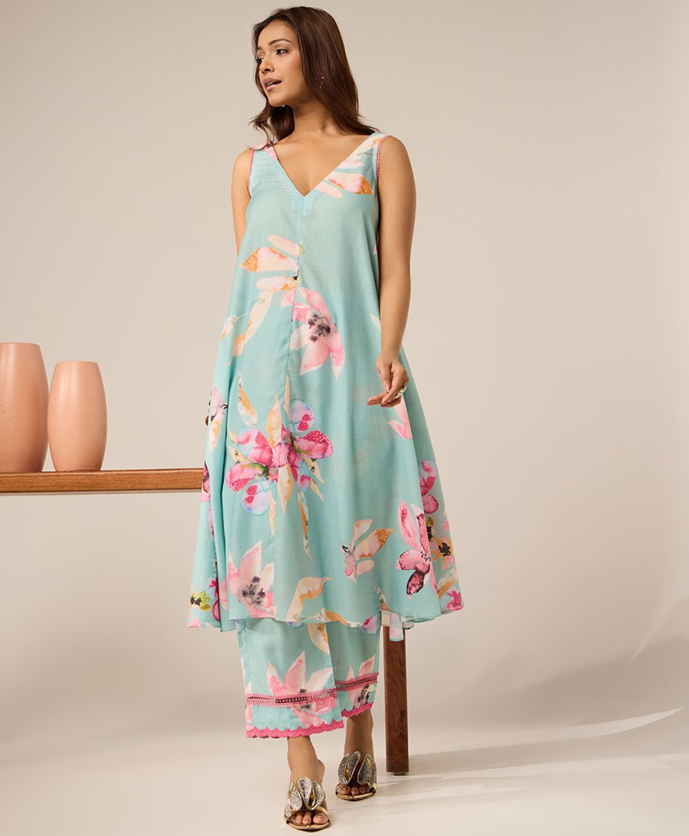 Mint Green Printed Cotton Kurta with Pants- Set of 2 – Mist Flora