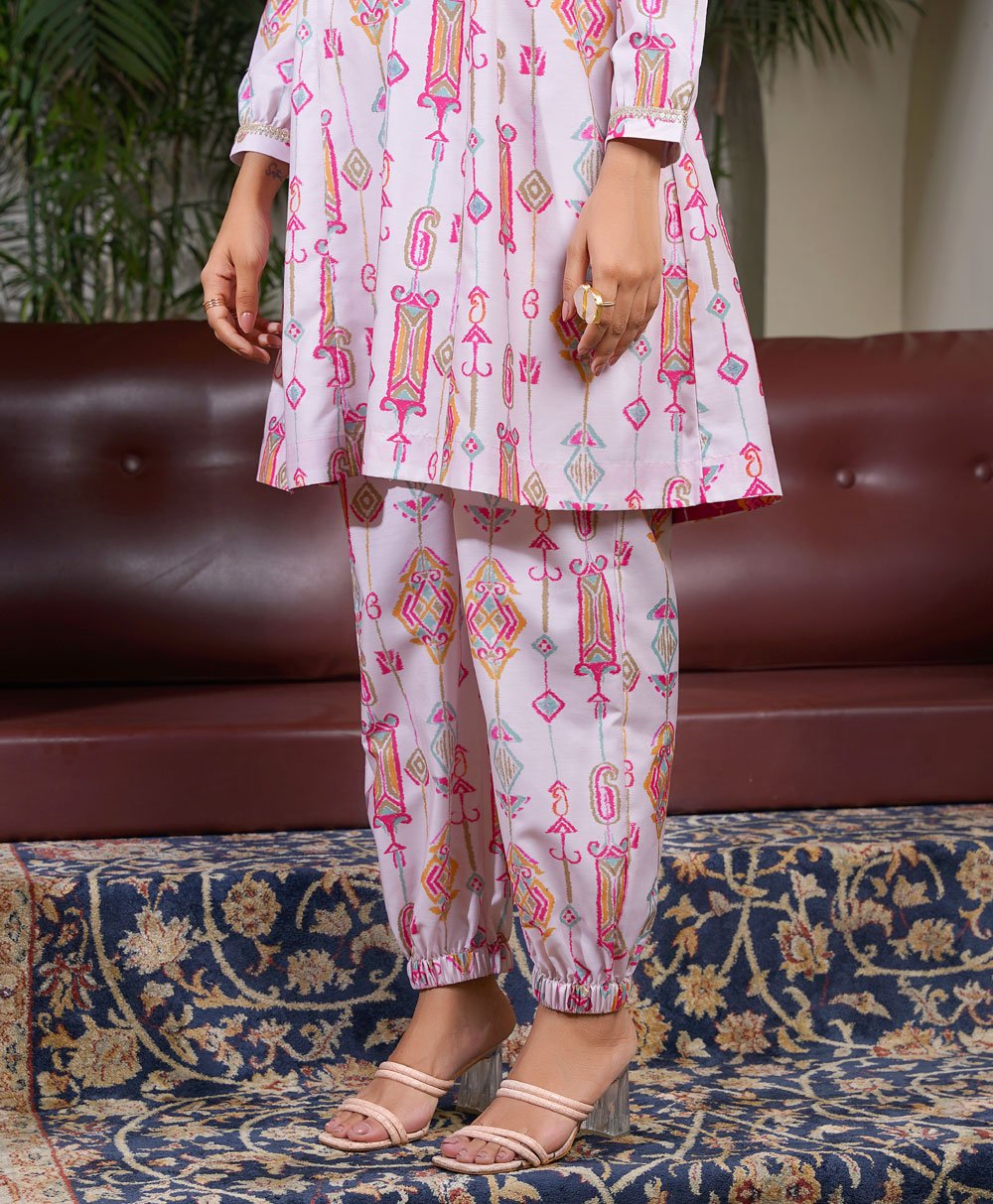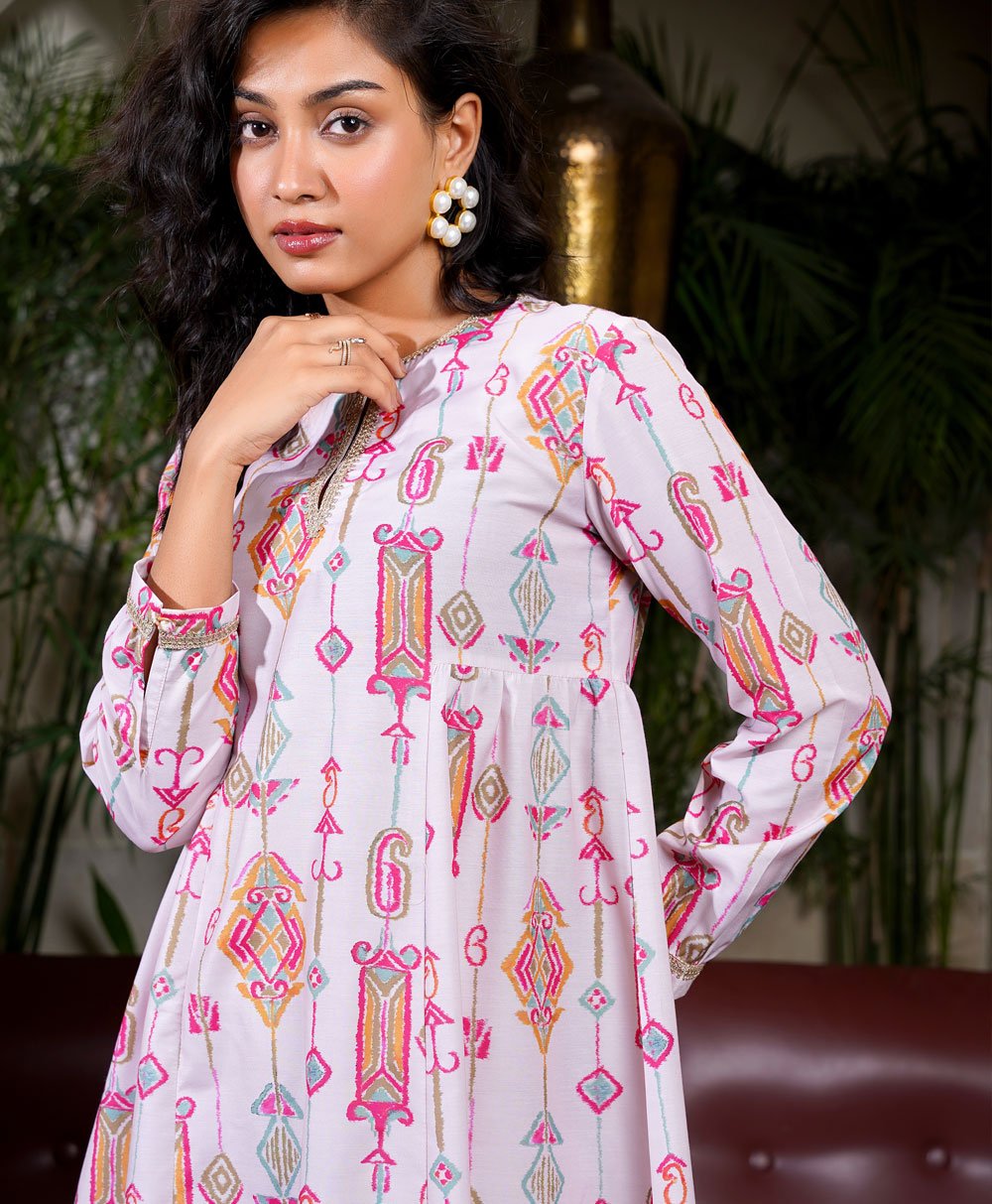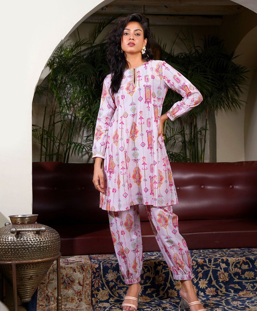 Comfortable fit short kurta with side gathers is a perfect festive fit. Pants have elasticated bottoms to give a fitted look.