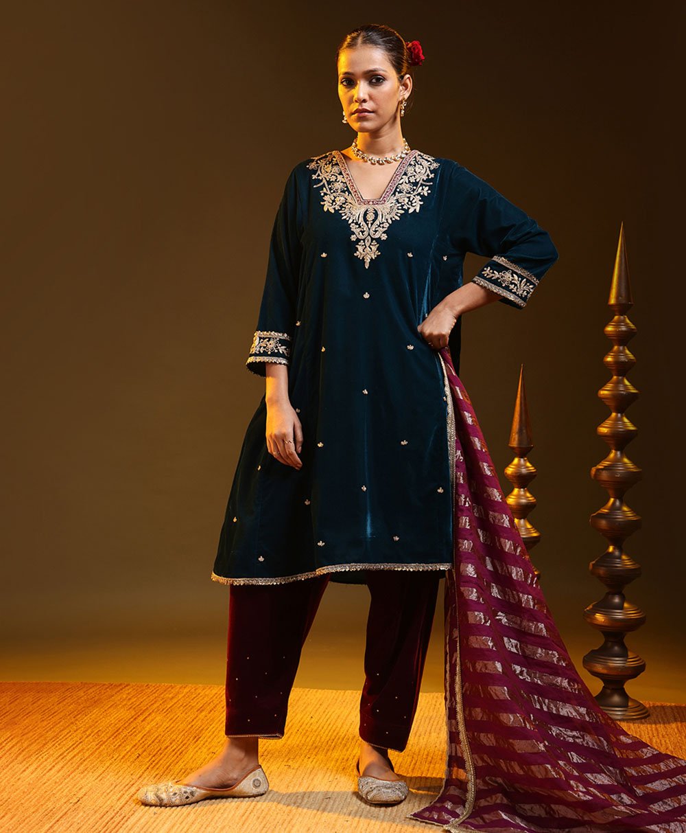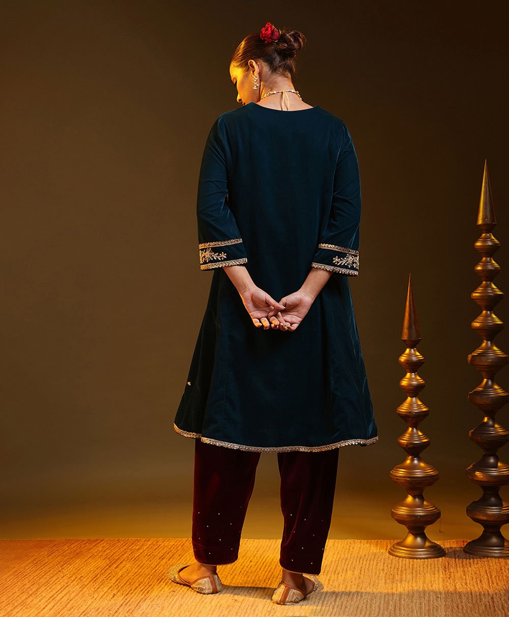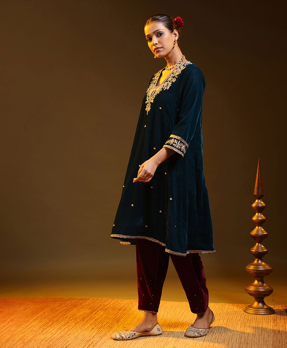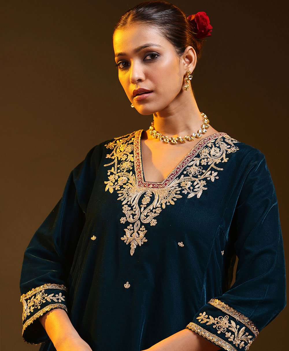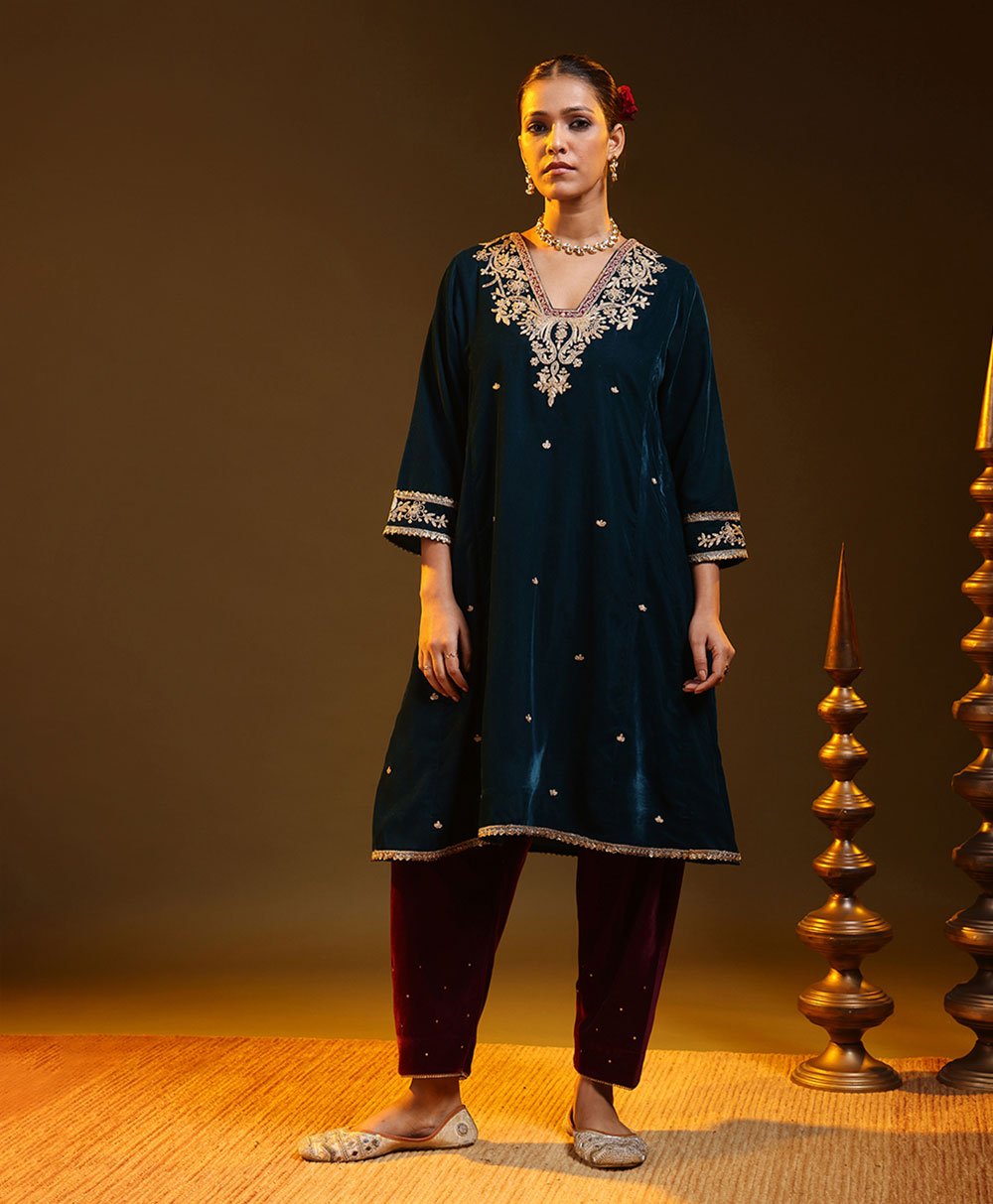 Deep teal kurta with delicate embroidery and relaxed silhouette paired with contrasting pants breathable fabric easy fit subtle elegance perfect for festive days office wear and evening outings understated ethnic charm modern comfort refined detailing made for women who want style without drama bas bas kaafi hai samjho classy cheez hai ye outfit